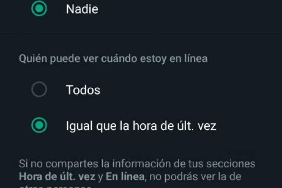 Para ajustar el “En Línea” es necesario ir a Ajustes de WhatsApp > Cuenta > Privacidad > Último visto y en línea. Aquí se encontrarán las mismas cuatro opciones para el estado de último visto: Todos, Nadie, Mis contactos y Mis contactos excepto…