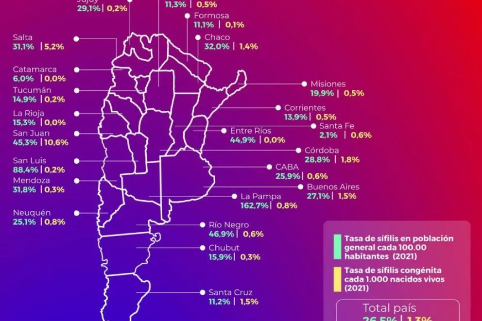 Según el Boletín, en 2021 se observaron valores de sífilis particularmente elevados en algunas jurisdicciones como La Pampa (con una tasa de 162,7 casos por 100.000 habitantes), San Luis (88,4) y Río Negro (46,9).