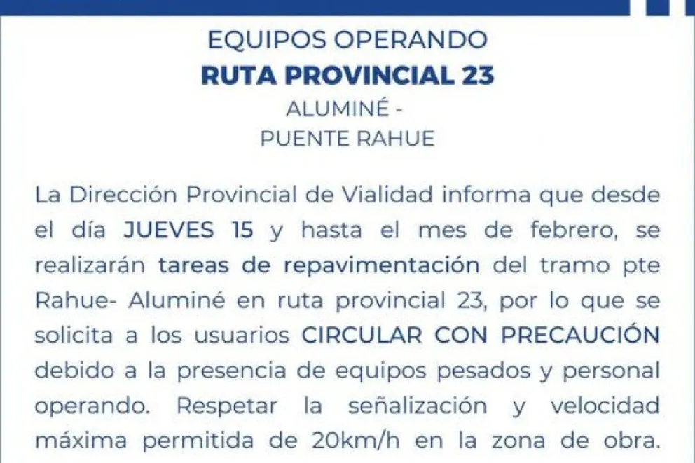 Actualidad Precaución al circular por el Rahue por trabajos viernes 16 de diciembre de 2022 Compartí esta nota: Te puede interesar Acuerdo salarial Empleados municipales de Neuquén cobrarán un aumento del 9,16% a fin de mes Infraestructura deportiva Avanzan las obras del Skate Park del Parque Lineal Pocahullo Conflicto con prestadores de salud Clínicas de Neuquén y Río Negro analizan este viernes en Plenario nuevas medidas a las prestaciones al PAMI Reclamo por la tasa vial Bomberos cuestionan el cobro de un impuesto y advierten por el impacto en sus finanzas Andacollo: ya se reciclaron más de 3 mil kilos de cartón en lo que va de 2026 Neuquén prohibió limpiavidrios, “trapitos” y lavacoches en semáforos Anuncian la licitación de la pavimentación de la ruta hacia Manzano Amargo Fin de la temporada de riego Cerrarán compuertas en el Dique Ballester y comenzará el vaciado de canales en el Alto Valle Riesgos digitales y protección de infancias Neuquén conforma la Mesa Provincial para prevenir delitos y riesgos en Internet Últimas noticias Clausuran una sala de elaboración en Viedma y decomisan 680 kilos de carne en mal estado Milei acompañará a Adorni en el Congreso en medio de la polémica por sus viajes Neuquén impulsa un megaproyecto de USD 12.000 millones en Vaca Muerta con apoyo de GyP Acuerdo salarial Empleados municipales de Neuquén cobrarán un aumento del 9,16% a fin de mes Condenan a una mujer a pagar $30 millones por difamar a su expareja en redes sociales durante seis años Conflicto con prestadores de salud Clínicas de Neuquén y Río Negro analizan este viernes en Plenario nuevas medidas a las prestaciones al PAMI Reclamo por la tasa vial Bomberos cuestionan el cobro de un impuesto y advierten por el impacto en sus finanzas