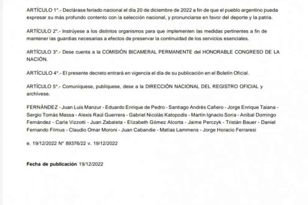 El gobierno nacional decidió este lunes decretar el martes como feriado nacional a través de un Decreto de Necesidad y Urgencia (DNU) que se conocerá en las próximas horas. El objetivo es que los argentinos puedan salir a festejar con el equipo que logró ganar la Copa del Mundo en Qatar.
