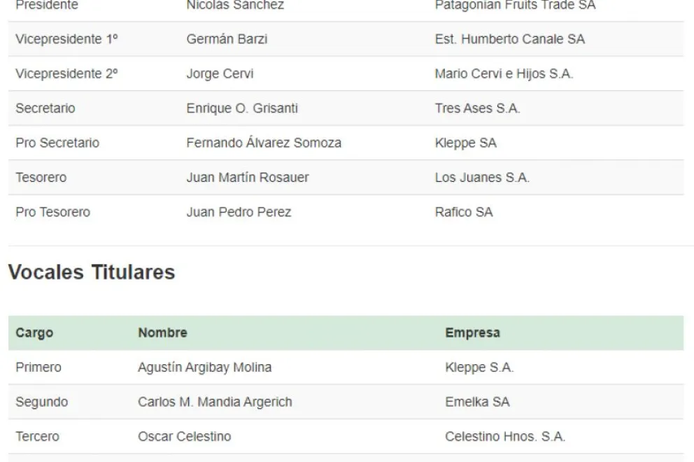 Será presidida por Nicolás Sanchez, un joven empresario nacido y criado en la región, de familia tradicional en la fruticultura, es Licenciado en Administración de Empresas con un Master en Administración de Negocios, Gerente General de Patagonian Fuits SA y Moño Azul SA. Es un apasionado por la gestión y el emprendedurismo, lo cual promueve desde Endeavor, ONG de alcance internacional dedicada a apoyar a emprendedores a lo largo del mundo.