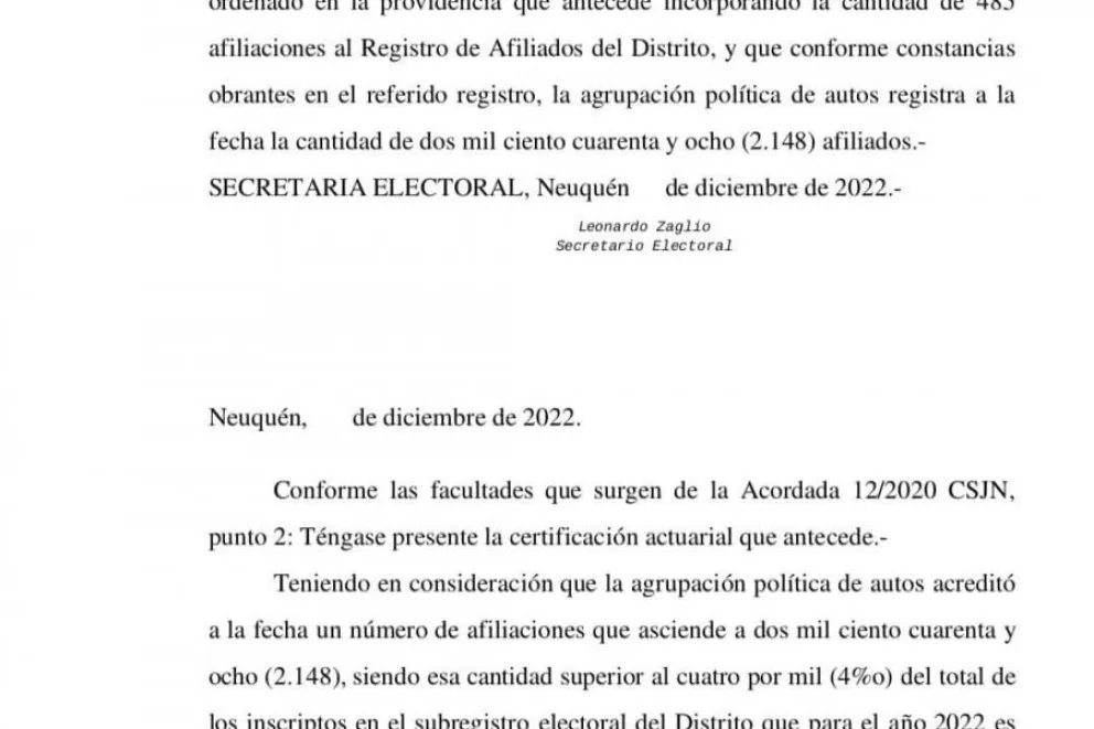 La Justicia Federal de Neuquen dió el visto bueno a las 2.148 afiliaciones de Desarrollo Ciudadano, partido que lidera la intendenta de Plottier, Gloria Ruiz.