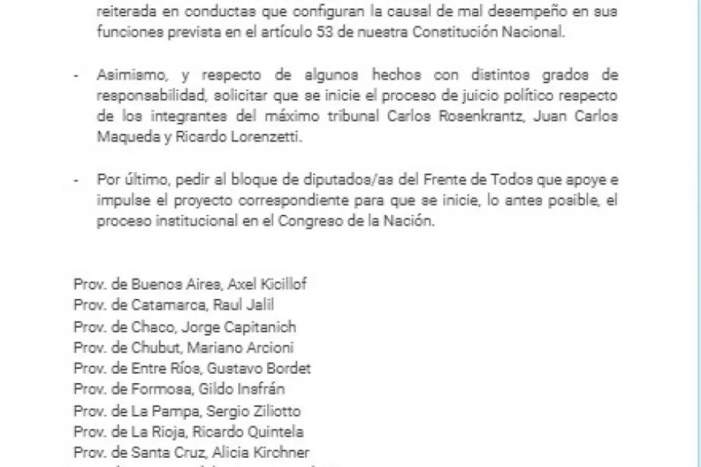 "Junto a gobernadores y gobernadoras hemos tenido una reunión con el señor presidente con el objetivo de propiciar la firma de un pedido de juicio político en el marco del artículo 53 de la Constitución Nacional, en virtud del mal desempeño de funciones de los cuatro jueces de la Corte Suprema de Justicia", indicó Capitanich durante una conferencia en la Casa Rosada junto al jefe de Estado y otros representantes de las provincias.
