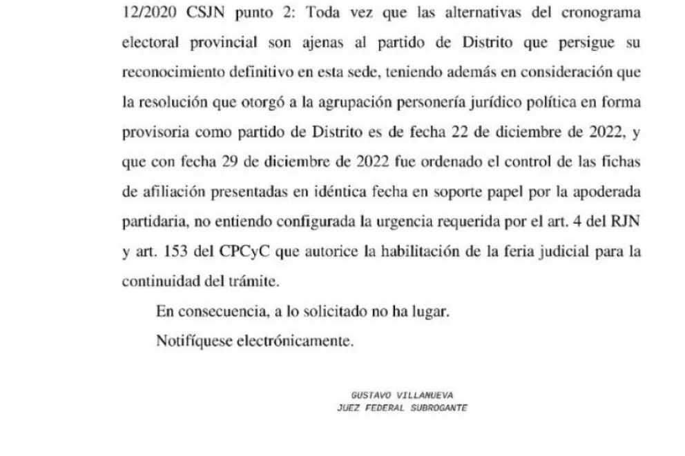 La justicia entiende que los plazos electorales que deben cumplirse previo a los comicios son suficientes y no cree necesario habilitar despachos durante la feria judicial de enero, afirmaron desde el entorno de Figueroa.
