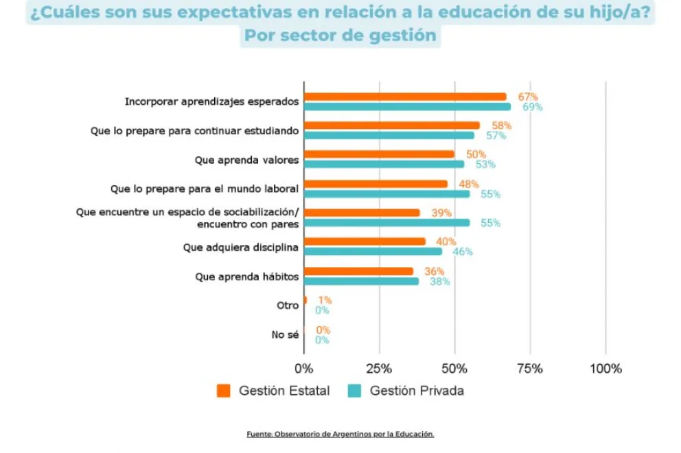 La incorporación de aprendizajes es la principal expectativa que depositan en la escuela tanto las familias de gestión estatal (67%) como las de gestión privada (69%). Para 6 de cada 10 familias, también es muy importante que la escuela prepare a los alumnos para continuar estudiando (58% en sector estatal y 57% en sector privado).