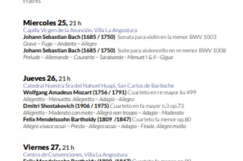 Villa La Angostura.- Del 23 al 27 de enero de 2023, organizada por la Asociación Filarmónica de los Siete Lagos (AF7L) con la colaboración de la Municipalidad de Villa La Angostura (MVLA), tendrá lugar una nueva edición de la Semana Musical de los Siete Lagos. En esta ocasión los conciertos estarán a cargo de Julián Gil (violín), Alix Lagasse (violín) y Germán Clavijo (viola), (London Symphony Orchestra), y Kate Gould (cello) (European Chamber Orchestra).