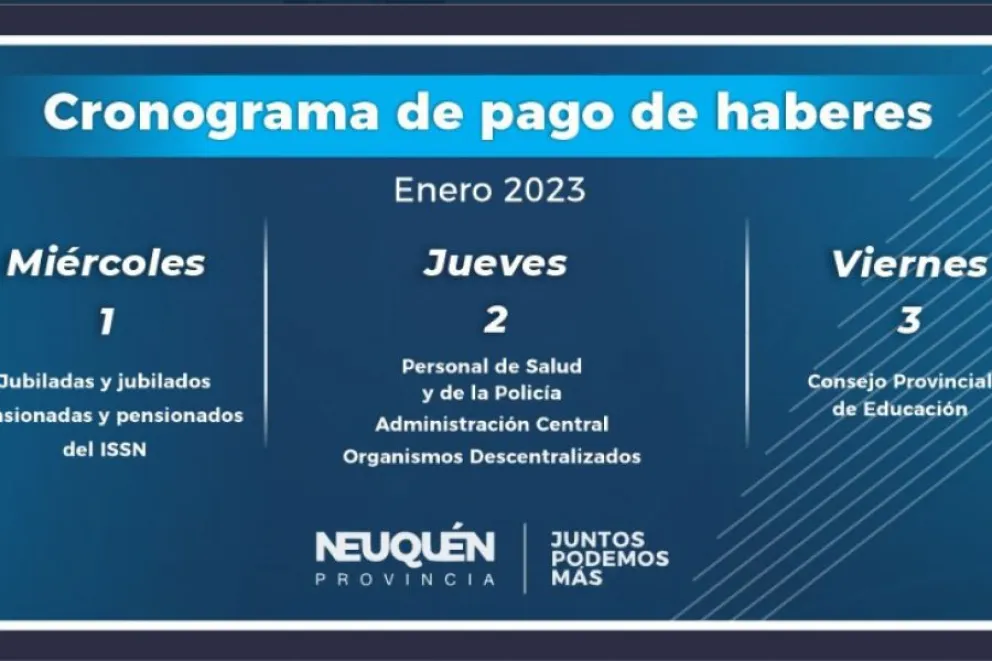 Este miércoles comienza el cronograma de pago de haberes a la administración pública de la provincia. El 1 de febrero cobrarán los sueldos de enero jubilados y pensionados del ISSN; el jueves 2 será el turno de los agentes de Salud, Policía, Administración Central y organismos descentralizados, mientras que el viernes 3 percibirán sus haberes los empleados dependientes del Consejo Provincial de Educación.