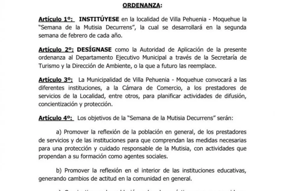 Villa Pehuenia.- Por iniciativa del vecino Eduardo Villaverde el Concejo Deliberante de esta localidad decretó que " la segunda semana de todos los meses de febrero se desarrollará la de la Mutisia Decurrons".