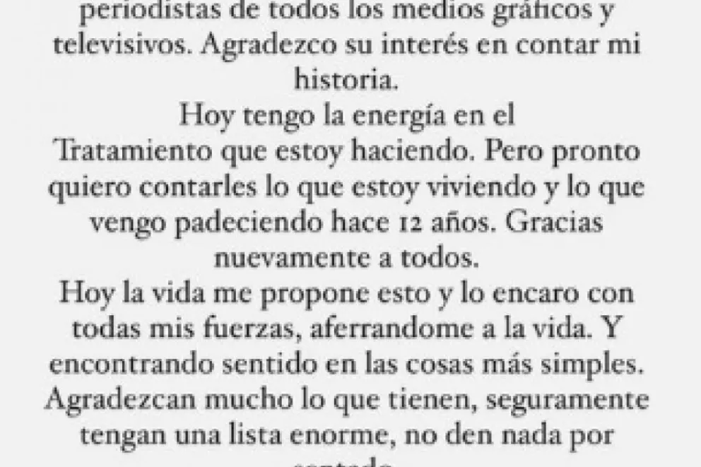 La modelo publicó, en la tarde de este miércoles, un agradecimiento a todos los que la están apoyando en este momento: “Hoy tengo la energía en el tratamiento que estoy haciendo. Pero pronto quiero contarles lo que estoy viviendo y lo que vengo padeciendo hace 12 años”, escribió en sus redes sociales.