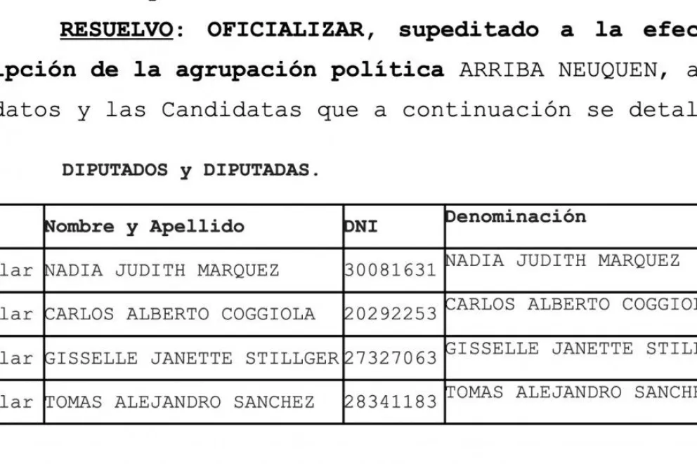 Por otra parte, la Justicia informó que los candidatos de Arriba Neuquén se encuentran supeditados