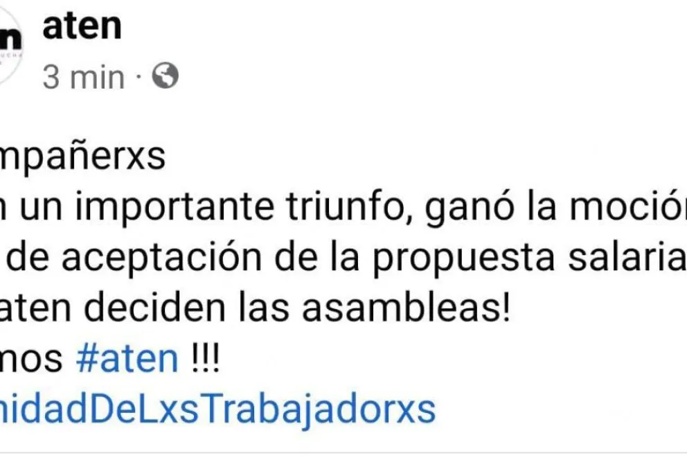 Neuquèn.- ATEN provincia aprobó la propuesta del gobierno. Un total de 1893 aceptaron y 1475 fueron por el rechazo.
