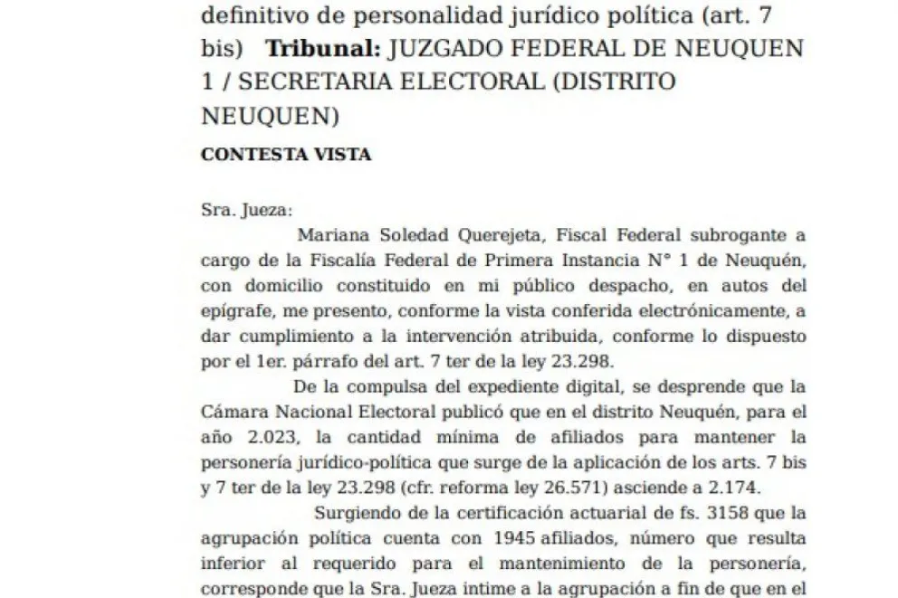 El escrito señala " De la compulsa del expediente digital, se desprende que la Cámara Nacional Electoral publicó que en el distrito Neuquén, para el año 2.023, la cantidad mínima de afiliados para mantener la personería jurídico-política que surge de la aplicación de los arts. 7 bis
