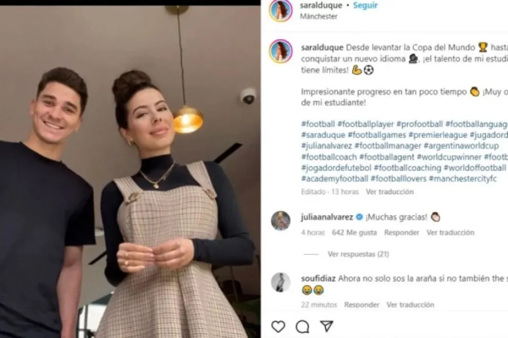 La joven que le enseña el idioma al ex River desde que se marchó a Manchester City de Inglaterra en junio de 2022 se deshizo en elogios para "La Araña", que brilló en "La Albiceleste" y rinde en los pocos minutos que juega en el equipo dirigido por Pep Guardiola. Ahora, Duque quedó maravillada con su alumno y el cordobés le respondió a través de su cuenta oficial de Instagram (@juliaanalvarez).