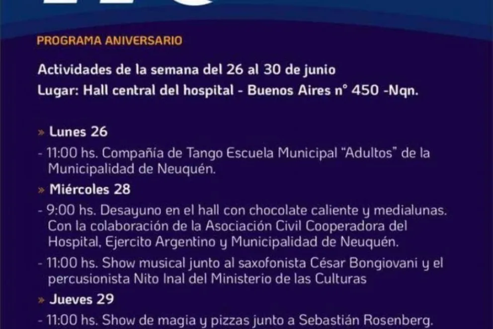 Actividades de la semana del 26 al 30 de junio. Lugar: Hall central del hospital - Buenos Aires, 450 -Nqn.