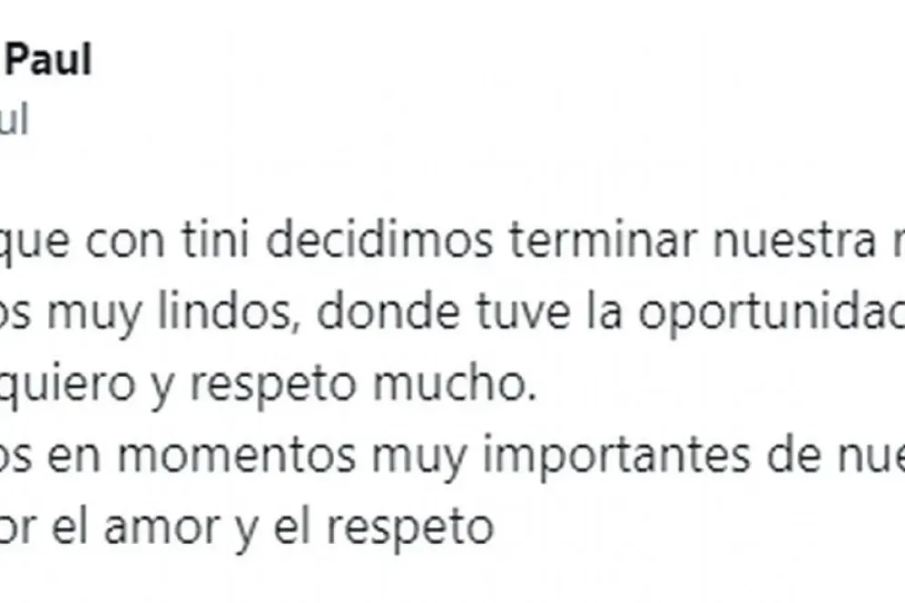 El jugador campeón del mundo publicó: “Quiero contarles que con Tini decidimos terminar nuestra relación. Vivimos momentos muy lindos, donde tuve la oportunidad de conocer a una persona que quiero y respeto mucho. Nos acompañamos en momentos muy importantes de nuestras vidas. Muchas gracias por el amor y el respeto”.