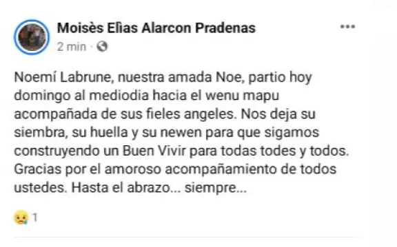 La noticia de su fallecimiento se conoció este mediodia y asi la despidió su hijo: "Noemí Labrune, nuestra amada Noe, partio hoy domingo al mediodia hacia el wenu mapu acompañada de sus fieles angeles. Nos deja su siembra, su huella y su newen para que sigamos construyendo un Buen Vivir para todas todes y todos. Gracias por el amoroso acompañamiento de todos ustedes. Hasta el abrazo... siempre..."