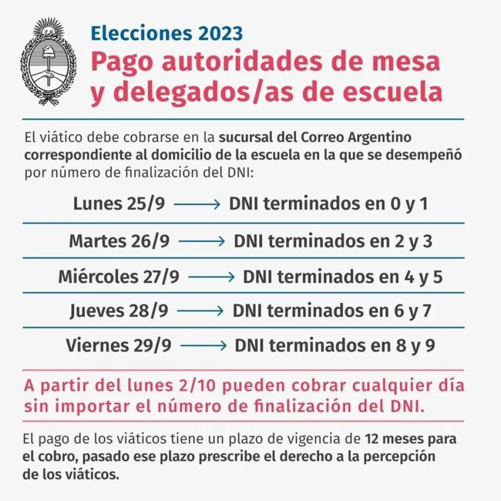 La Secretaría Electoral Nacional informa que el lunes 25 comienza el cronograma pago de los viáticos a las autoridades de mesa y Delegado/as que actuaron en las elecciones nacionales de las PASO.