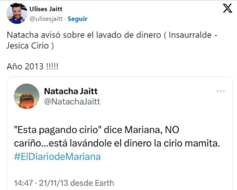 Natacha avisó sobre el lavado de dinero (Insaurralde - Jesica Cirio) ¡Año 2013!”, escribió el conductor, al repostear un mensaje de su hermana del 21 de noviembre de ese año: “‘Está pagando Cirio’, dice Mariana. NO, cariño... Está lavándole el dinero la Cirio, mamita”, haciendo referencia a un comentario realizado en el programa de Mariana Fabbiani, “El Diario de Mariana”.