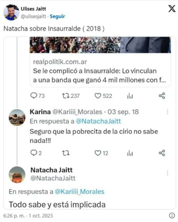 Un tercer posteo acusaba a Jesica de ser cómplice de Insaurralde al saber cómo se estaba enriqueciendo. Es de septiembre de 2018, cuando una usuaria de X (antes Twitter) había retuiteado una noticia sobre el político: “Se le complicó a Insaurralde: Lo vinculan a una banda que ganó 4 mil millones con facturas truchas”.