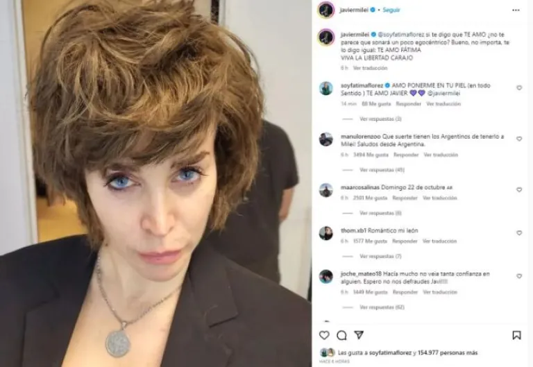 Halagado por este “gesto”, Milei acompañó la foto con un mensaje que desborda amor y complicidad: “Si te digo que te amo ¿no te parece que sonará un poco egocéntrico? Bueno, no importa, te lo digo igual: Te amo, Fátima”. Para dar cierre al posteo, usó su acostumbrada frase de campaña: “Viva la libertad, carajo”. Ella, en respuesta, escribió: “Amo ponerme en tu piel (en todo sentido) Te amo Javier”.