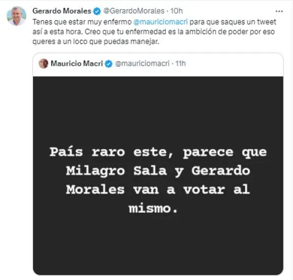 Por lo tanto, llamó la atención un reciente posteo de Mauricio Macri que logró aumentar la tensión entre las partes. “País raro este, parece que Milagros Sala y Gerardo Morales van a votar al mismo”, se leía en el tuit del expresidente de la Nación.