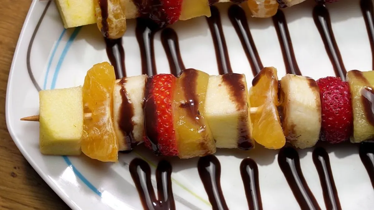 Brochetas de fruta con chocolate. Un postre original muy fácil y rápido de hacer en casa, pensado para que los niños coman fruta.