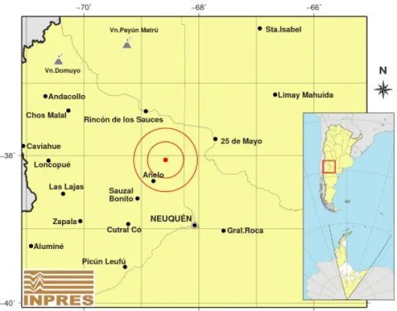 El epicentro fue a 109 km al NO de Neuquén; 414 km al O de Santa Rosa; 81 km al S de Rincón De Los Sauces -38.062 (lat) -68.605 (long)