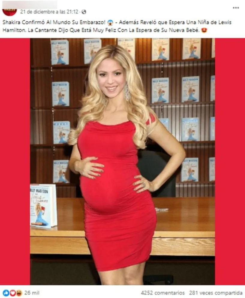 La cantante colombiana Shakira y el piloto automovilístico británico Lewis Hamilton son utilizados para generar desinformación en redes sociales. En Facebook se asegura que la intérprete de 'Te Felicito' ha anunciado de manera oficial que está gestando. “¡Shakira confirmó al mundo su embarazo! Además reveló que espera una niña de Lewis Hamilton. La cantante dijo que está muy feliz con la espera de su nueva bebé”, dice un post que supera las 30.000 reacciones y circula desde el 21 de diciembre.