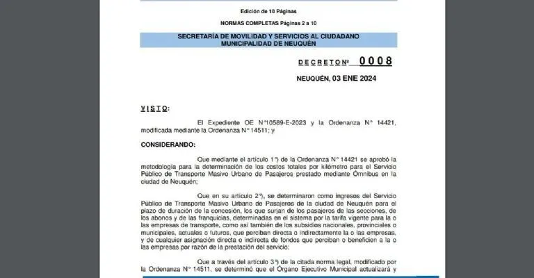 Neuquén.- A través del decreto, emitido el pasado 3 de enero y publicado en el Boletín oficial, estableció un 32 por ciento de incremento del costo del pasaje en el transporte urbano COLE. El boleto pasó de costar 280 pesos, a partir del 6 de diciembre, ahora saldrá 370 pesos, se estima que el aumento sea desde la semana próxima. Además, a mediados de enero, también aumentará el taxi en la ciudad de Neuquén.