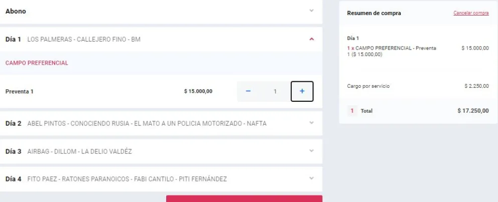 Las entradas están a la venta en www.protickets.com.ar y se puede optar por el pack 4 días, o elegir por día a tu artista favorito. Las entradas tendrán un valor de 15 mil pesos por día, más el cargo de servicio que es de $2.250, y se ofrece también un combo por los cuatro días de fiesta, que tendrá un valor total de 54 mil pesos. Los tickets se compran por Internet, a través de una página web que ya fue habilitada.