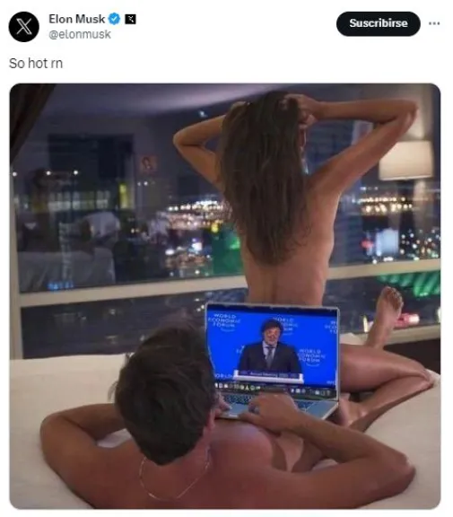 El magnate dueño de Telsa y X, Elon Musk posteo un meme con contenido sexual para elogiar al presidente, Javier Milei, tras su discurso en el foro de Davos. "So hot rn", escribió en la red social con una imagen donde se mezclan posturas sexuales con una captura del discurso de libertario ante los líderes del mundo.