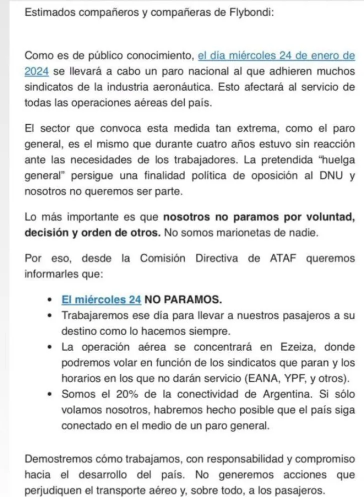 El sindicato de trabajadores de FlyBondi (ATAF) anuncia que NO PARA mañana.