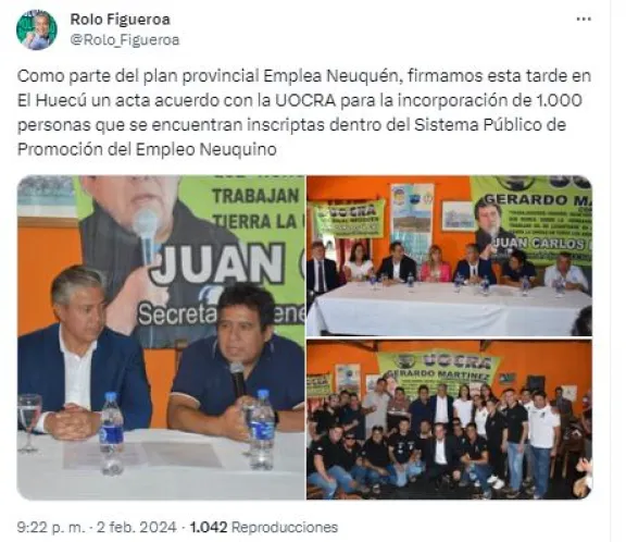 "Como parte del plan provincial Emplea Neuquén, firmamos esta tarde en El Huecú un acta acuerdo con la UOCRA para la incorporación de 1.000 personas que se encuentran inscriptas dentro del Sistema Público de Promoción del Empleo Neuquino", afirmó Figueroa.