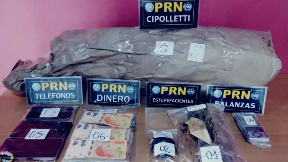 Se incautaron 67,6 gramos de cocaína, 501 gramos de marihuana prensada, ocho plantas de marihuana, 14.800 pesos en efectivo.