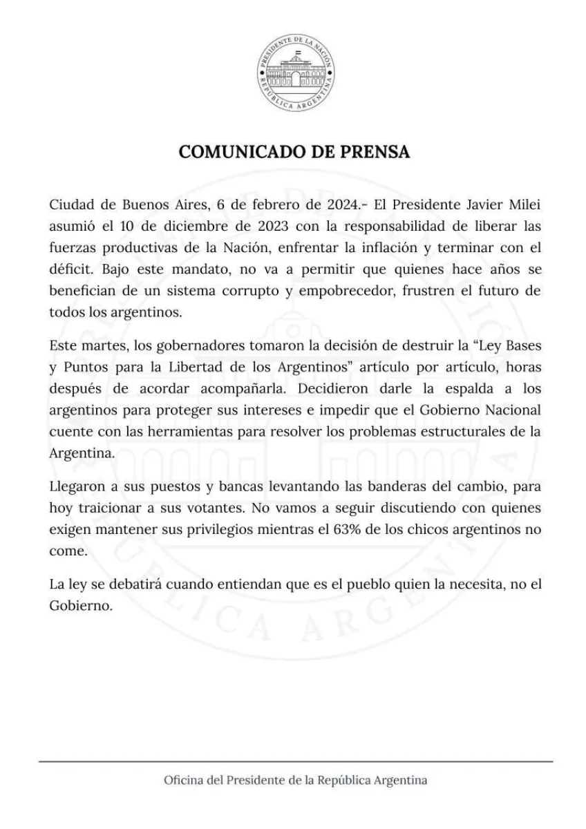 “Este martes, los gobernadores tomaron la decisión de destruir la ‘Ley Bases y Puntos para la Libertad de los Argentinos’ artículo por artículo, horas después de acordar acompañarla. Decidieron darle la espalda a los argentinos para proteger sus intereses e impedir que el Gobierno Nacional cuente con las herramientas para resolver los problemas estructurales de la Argentina”, manifestó.