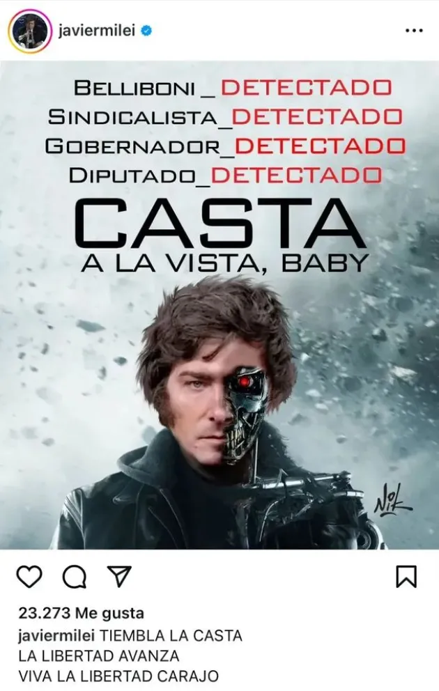 En su cuenta de Instagram, el mandatario, quien se encuentra de viaje oficial por Israel, utilizó una ilustración del dibujante Nik en la que presenta al propio Milei como el cyborg de la mítica zaga “Terminator”, protagonizada por Arnold Schwarzenegger, y en la que parafrasea la icónica frase que dejó ese personaje “Hasta la vista baby”.