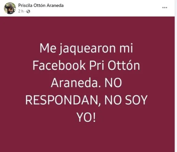 - No respondas a ningún mensaje que provenga de las cuentas de Facebook, Instagram o Twitter de Priscila Ottón.