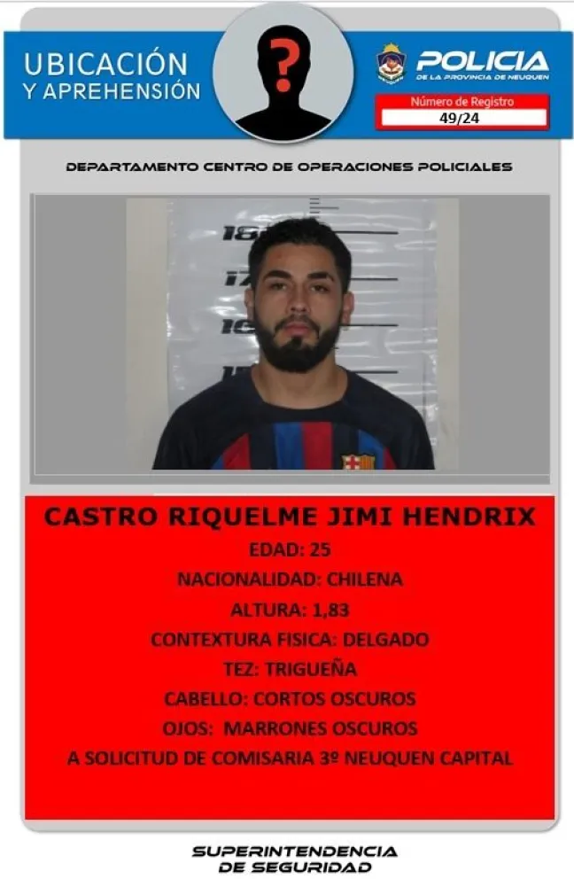El delincuente Castro Riquelme Jimi Hendrix está prófugo de la Justicia rionegrina y neuquina. Estuvo entre los seis internos se fugaron de una comisaría de Neuquén en una cinematográfica evasión.