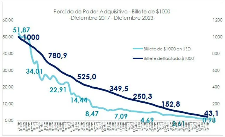 Para ejemplificar vamos a tomar el billete de 1000 pesos, desde su nacimiento en el 2017 hasta Diciembre 20233 el cual perdió todo su valor real. Nació siendo un billete de 1000 pero hoy ajustado por inflación vale tan solo 43 pesos. Si evaluamos su contrapartida en dólares veremos que nació con un valor de USD 51, hasta llegar a la actualidad con un valor de USD 0.98 centavos de dólar.