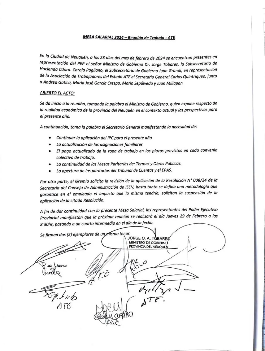 La reunión pasó a un cuarto intermedio hasta el jueves a las 8.30. Por parte del sindicato, estuvo presente el Secretario General, Carlos Quintriqueo.