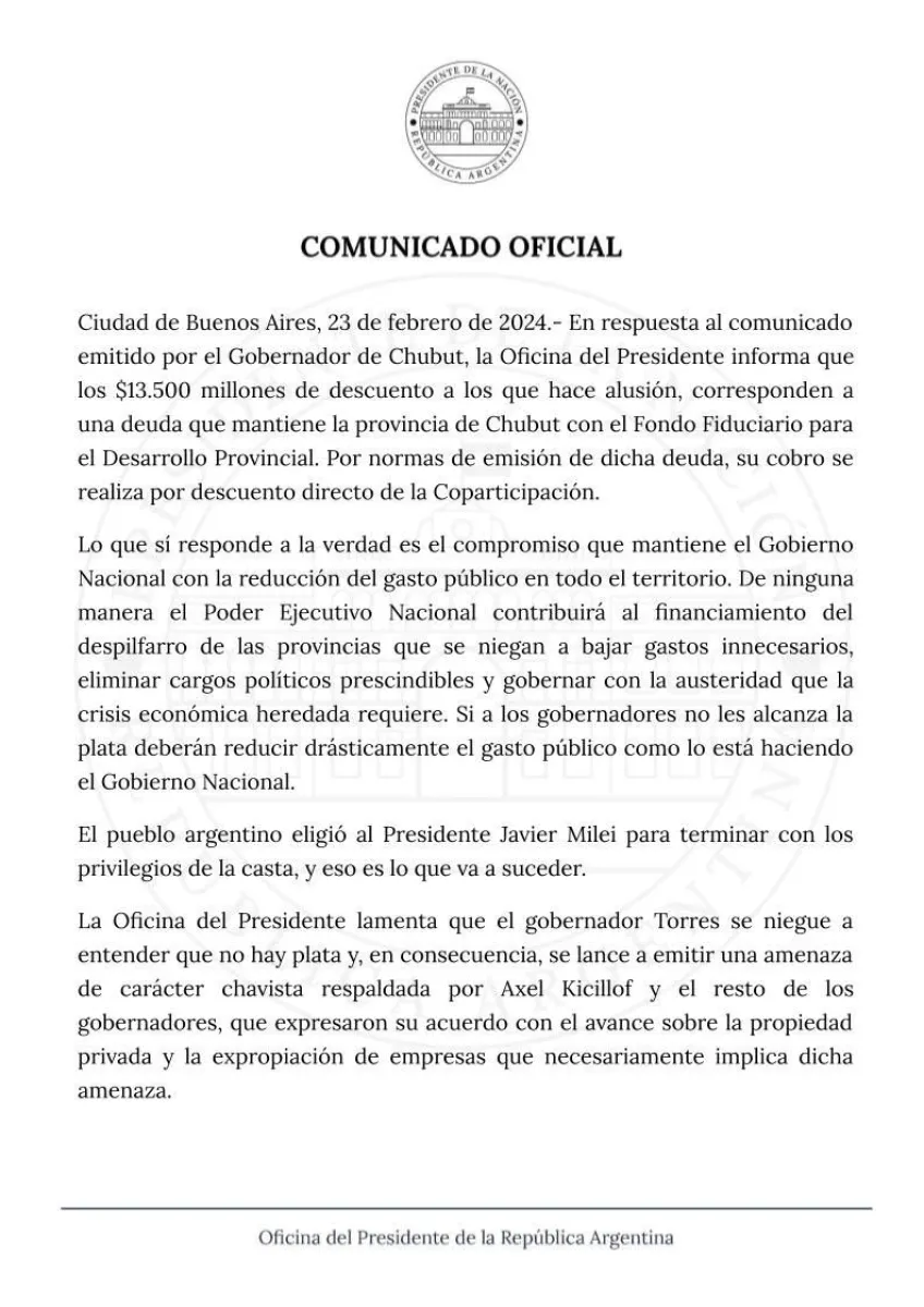 A través de un comunicado, la Oficina del Presidente señaló que esos fondos corresponden a “una deuda que mantiene la provincia de Chubut con el Fondo Fiduciario para el Desarrollo Provincial”. En ese sentido, explicaron que el cobro de dicha deuda “se realiza por descuento directo de la Coparticipación”.