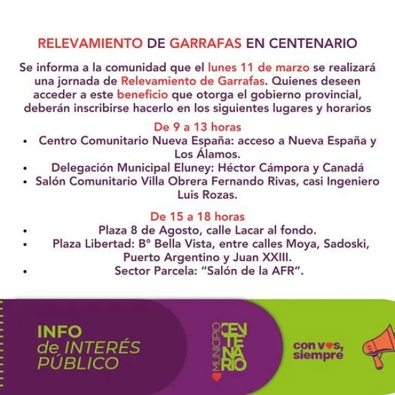 Centenario.- Se informa a la comunidad que el lunes 11 de marzo se realizará una jornada de Relevamiento de Garrafas.