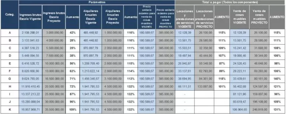 - La categoría K posee el mayor aumento, en relación a los ingresos anuales (109%), con un aumento en su cuota el 131%.