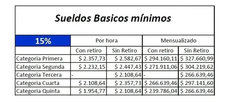 El nivel de mayor ingreso (categoría primera) corresponde al de supervisor, los sueldos pasarán a ser de $2.357,73 por hora con retiro y $2.582,67 por hora sin retiro.