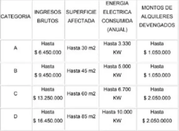 Los contribuyentes al monotributo se ubican en categorías idientificadas con letras que van de la A (menores ingresos) hasta la L (mayores ingresos). Las categorías se determinan de forma anual en base a los ingresos brutos, la superficie afectada y la energía eléctrica consumida. También contempla el monotributo social, que es una variante del régimen simplificado que permite contar con cobertura de obras social para el grupo familiar completo.