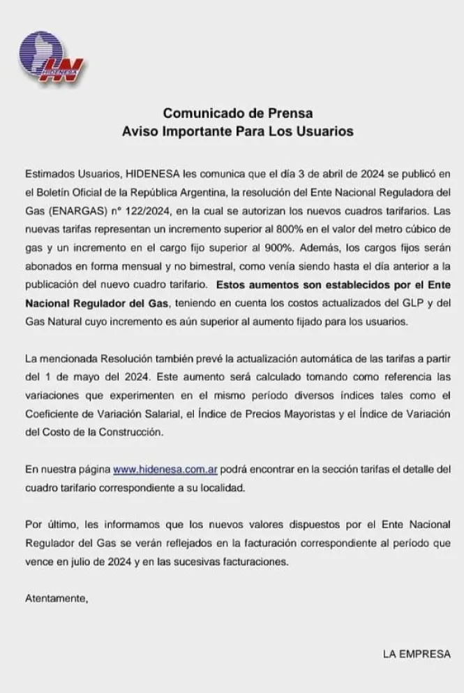 HIDENESA informó a sus usuarios que las nuevas tarifas representan un incremento superior al 800 por ciento en el valor del metro cúbico de gas y un incremento en el cargo fijo superior al 900 por ciento.