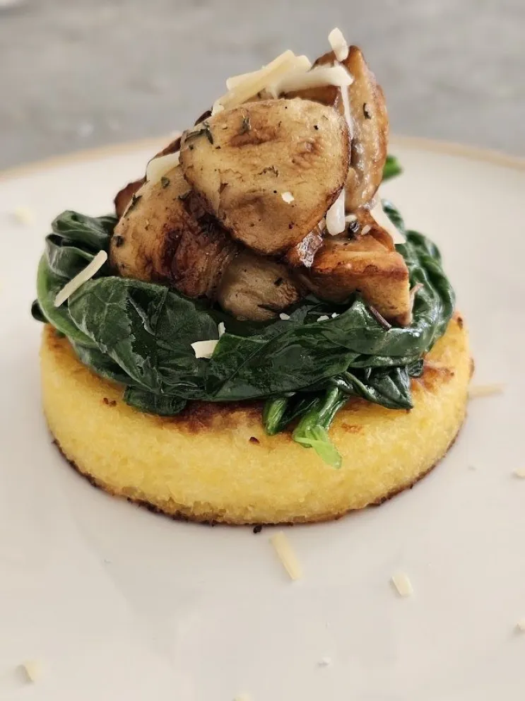 - Para armar el plato, cubrir con cuidado los trozos de polenta cocida con espinacas y luego champiñones y una ramita de tomillo fresco y espolvorear con queso parmesano
