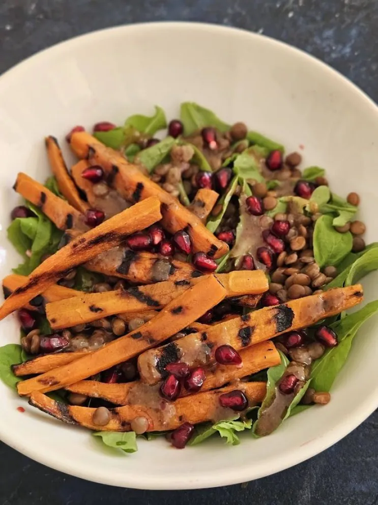 Ensalada de zanahorias asadas, lentejas y rúcula con aderezo de tahini