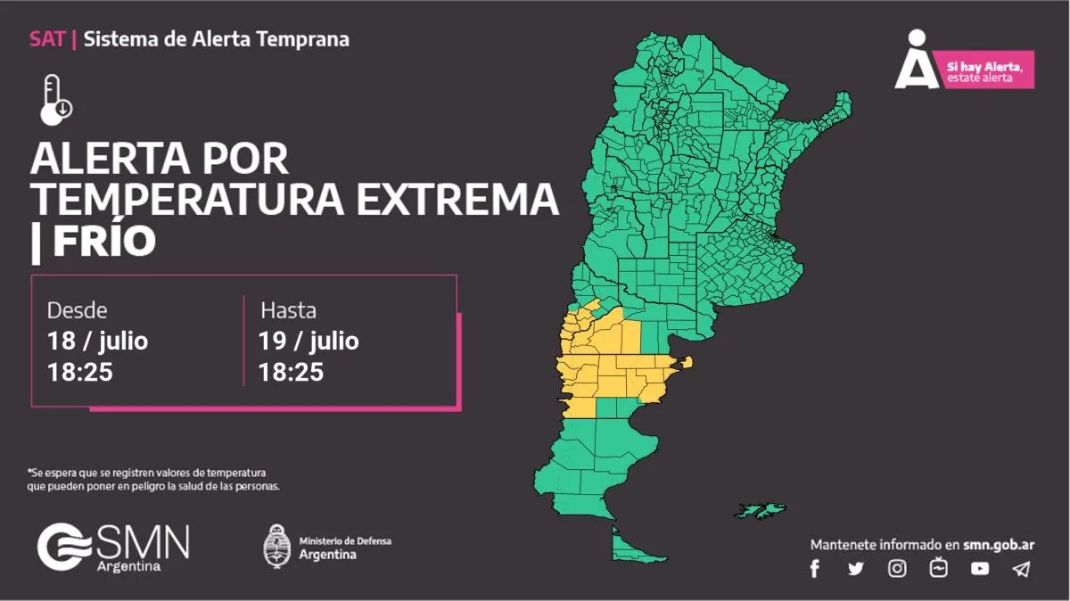 Según el SMN, las temperaturas mínimas esperadas para el viernes 19 de julio oscilarán entre -6°C y -2°C.