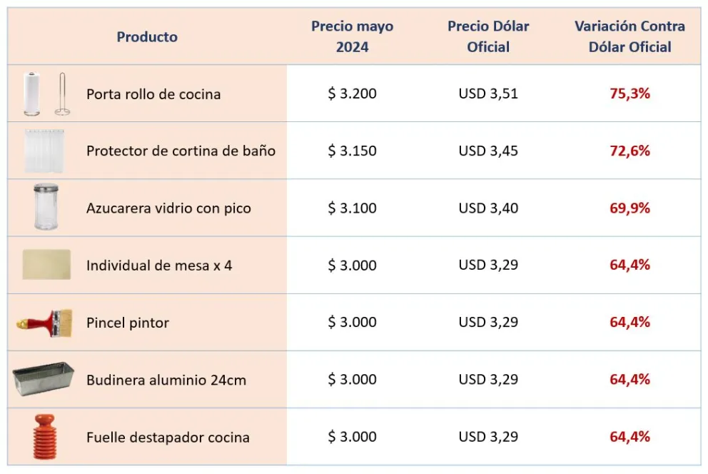 Ahora evaluando al precio del dólar oficial, observamos que en dólares se observan variaciones desde 20% hasta el 130%. Por ejemplo, si el gobierno decidiera dolarizar la economía, al tipo de cambio oficial, un porta rollo de cocina, desde los '90, aumentó un 75,3%. Para este análisis es interesante entender que $2 de los años noventa equivalía a US$2.